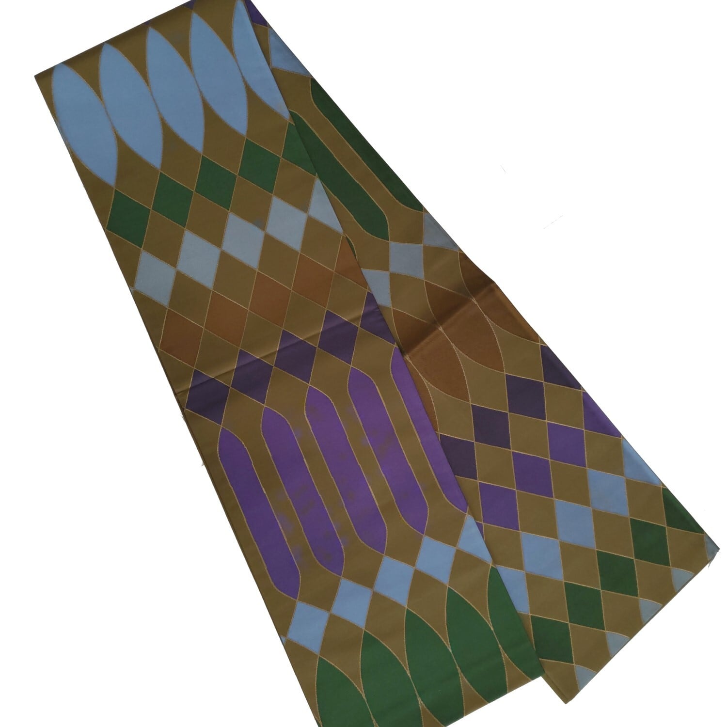 独自の世界観を持つ人形師故辻村ジュサブローさんのデザインの全通袋帯です。個性的な訪問着や付け下げ、小紋またはお振袖の変わり結びなどにもコーディネイト出来る帯です。