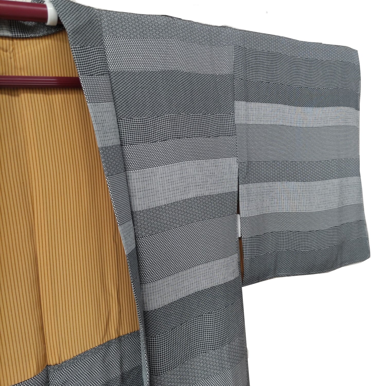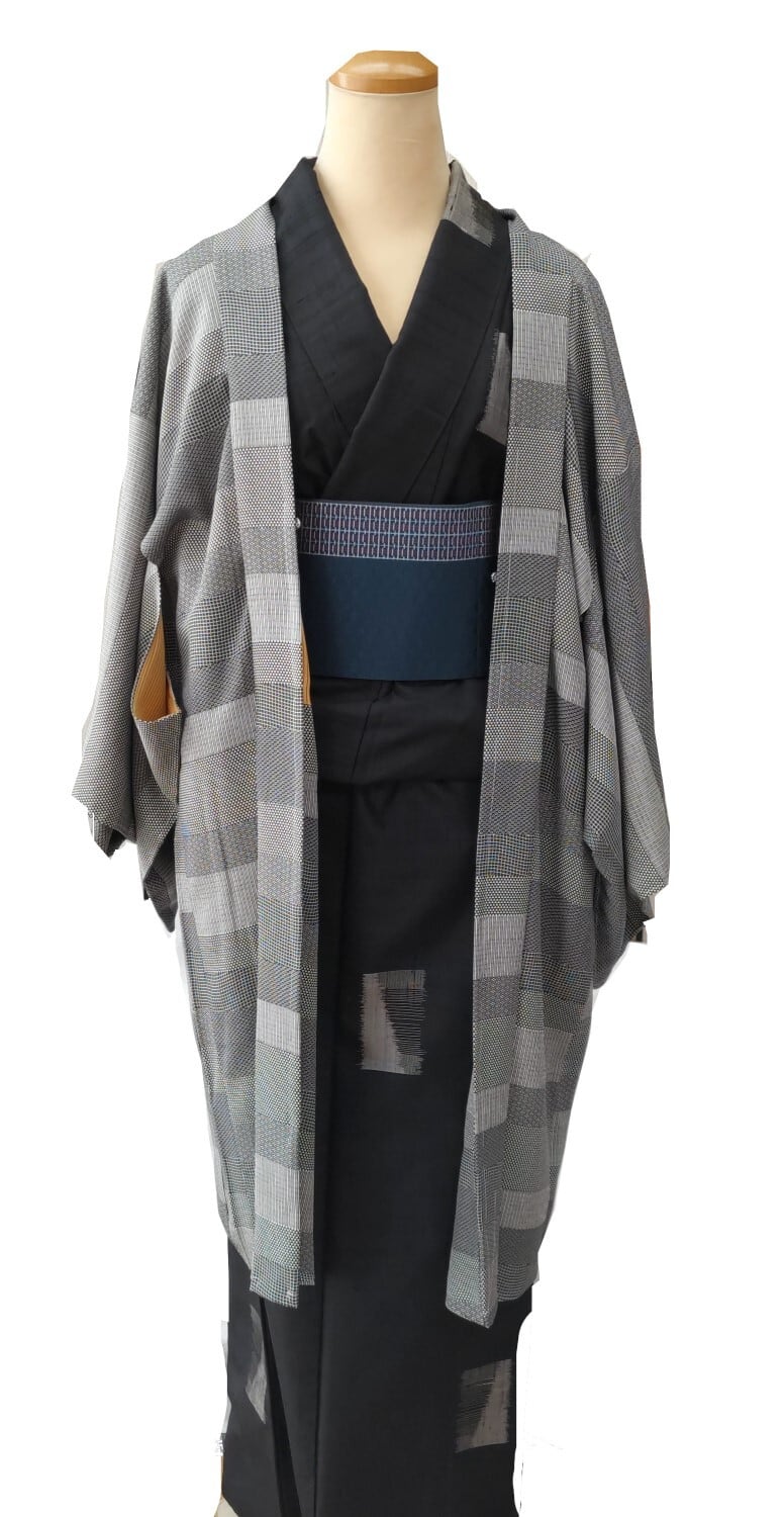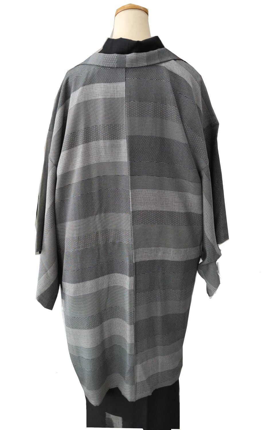 色々な形の違う柄を組み合わせた江戸小紋のすっきりした羽織です。サイズはゆき69cm 袖丈46cm 羽織丈99cm 後幅30cm です。状態は使用した感じ無く躾糸が付いたままです。紬や小紋など巾広く使って頂けると思います。