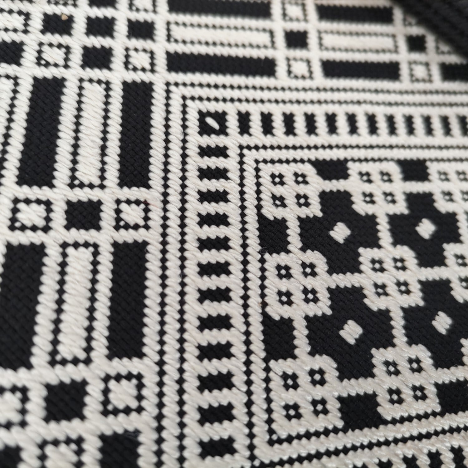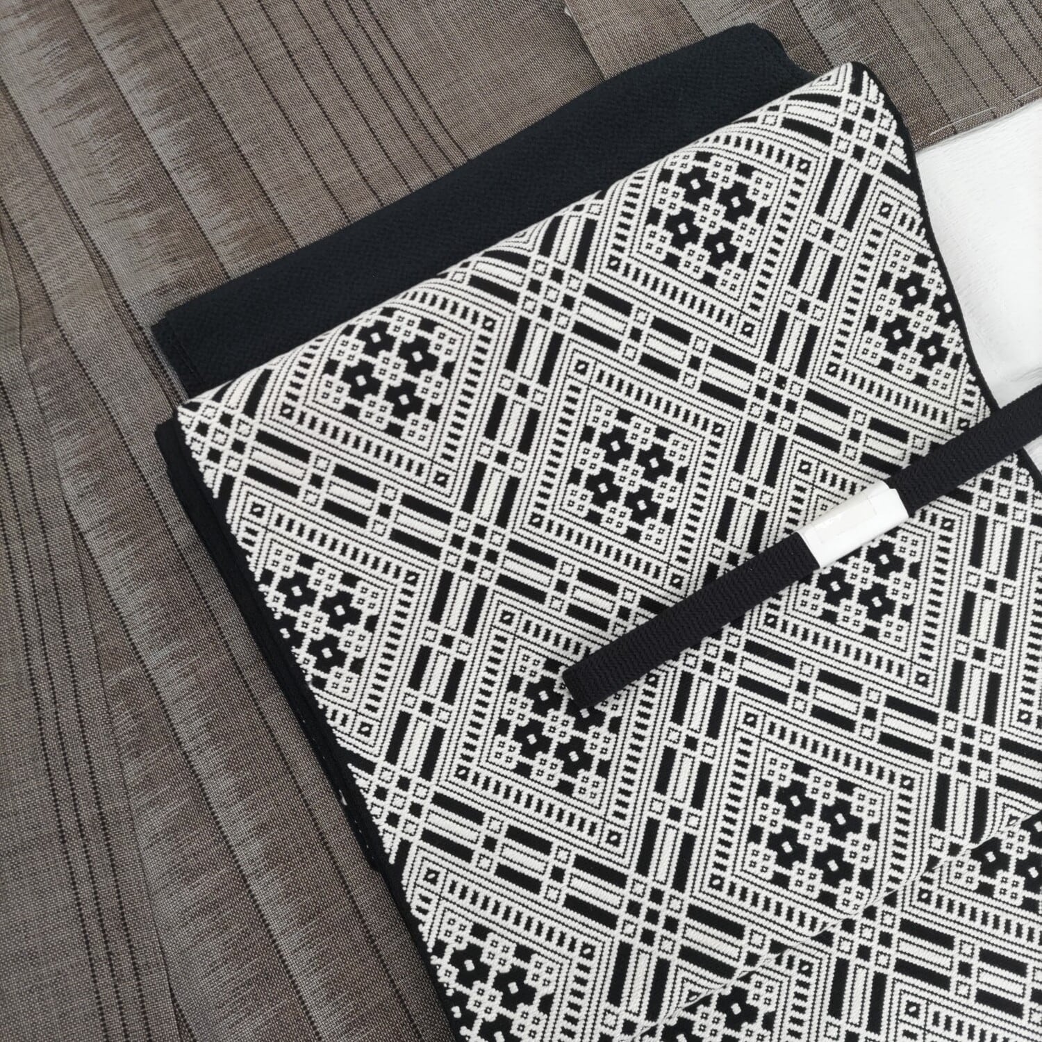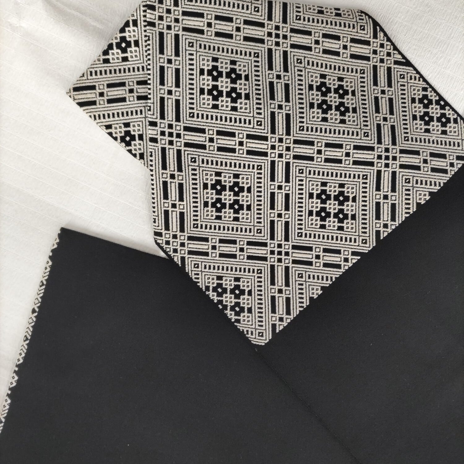 津軽の独特な幾何学模様のようなこぎん刺しの名古屋帯です。仕立ては松葉仕立て長さ3m68cmです。状態は数回使用しておりますがきれいな状態です。白と黒のモノトーンなので紬系統や飛び柄の小紋などによく締まると思います。