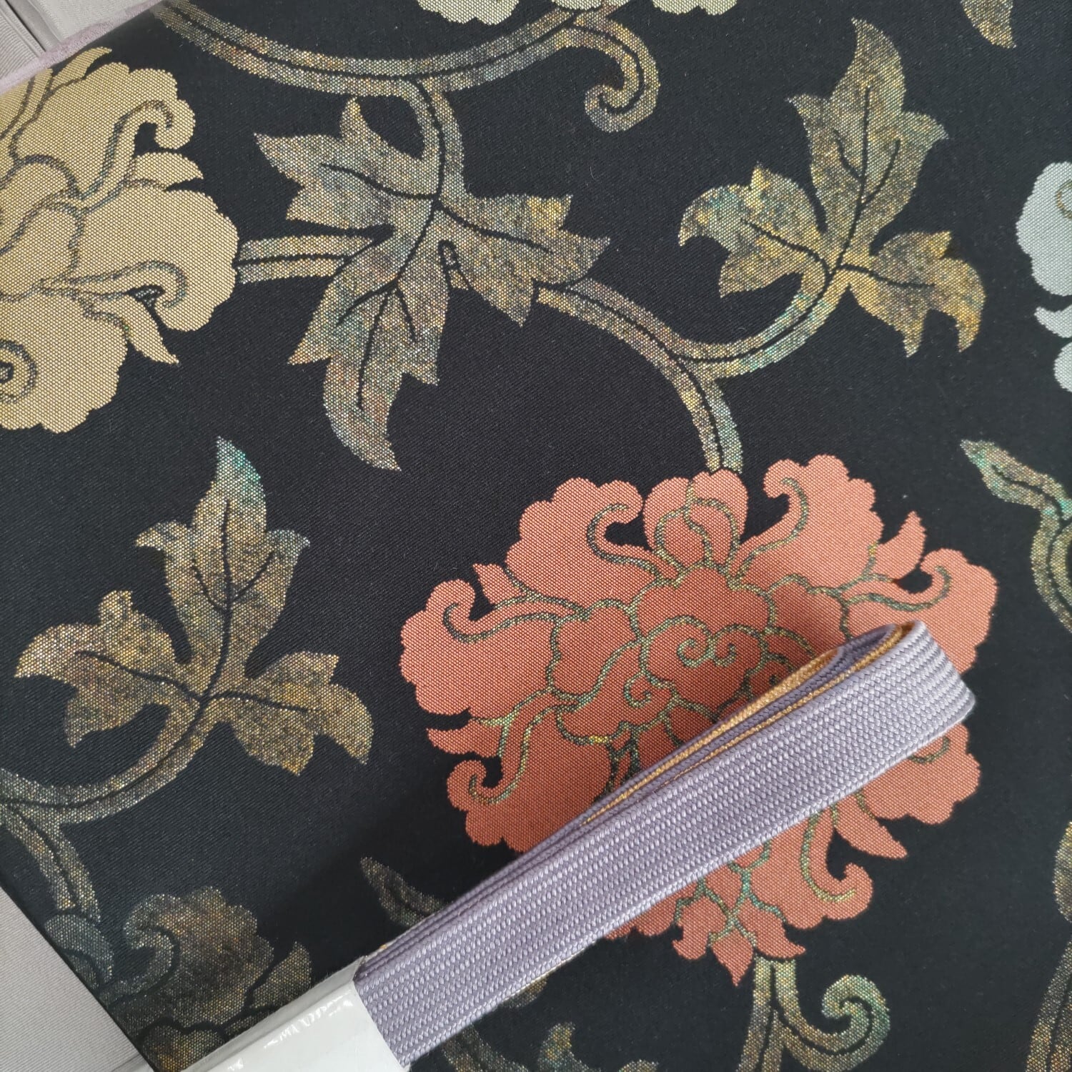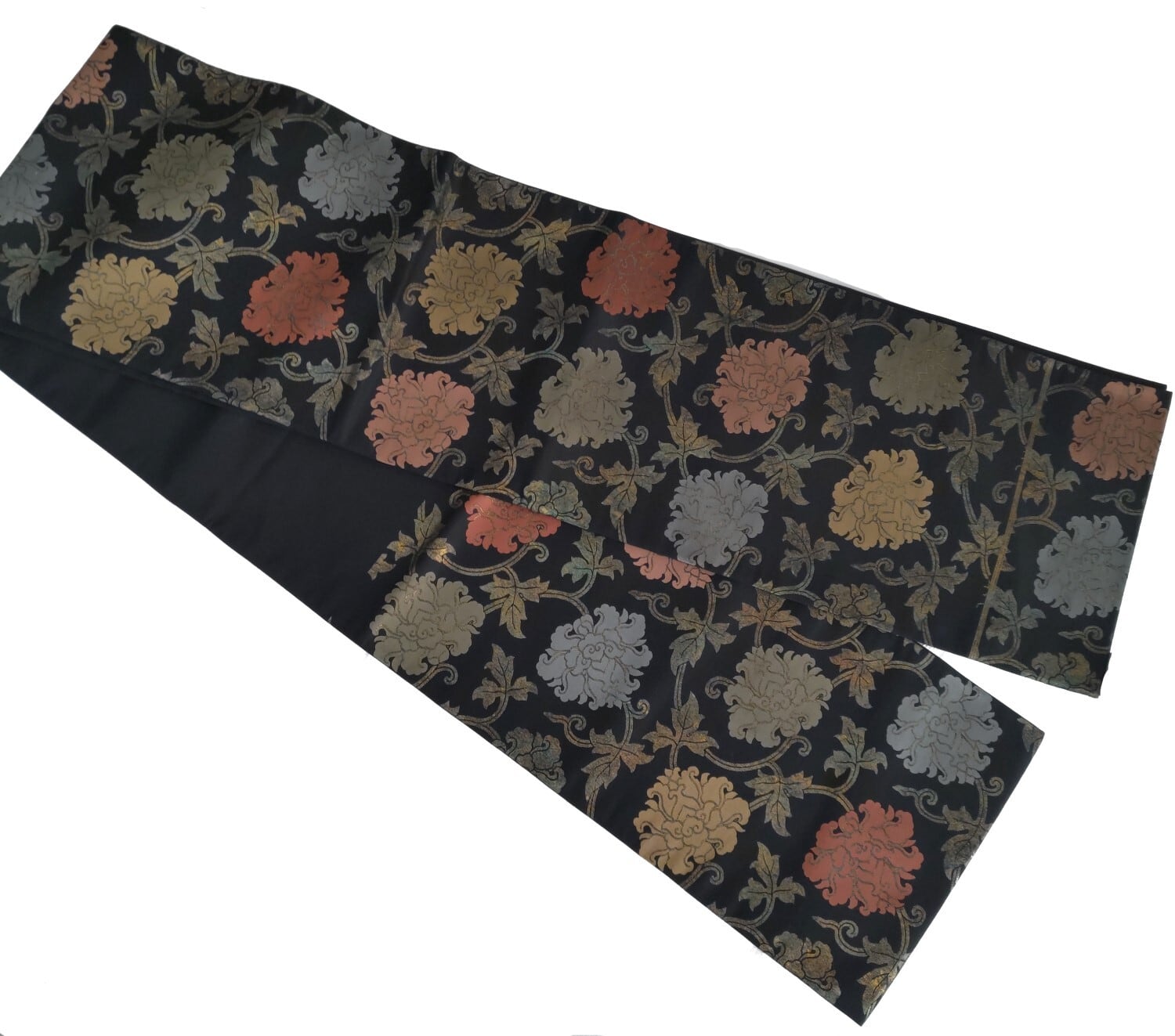 箔屋清兵衛さんの袋帯です。黒地で着物がしまる感じがします。牡丹唐草で素敵な帯です。状態は数回使用しておりますがそれほど使用感無く良好な状態です。