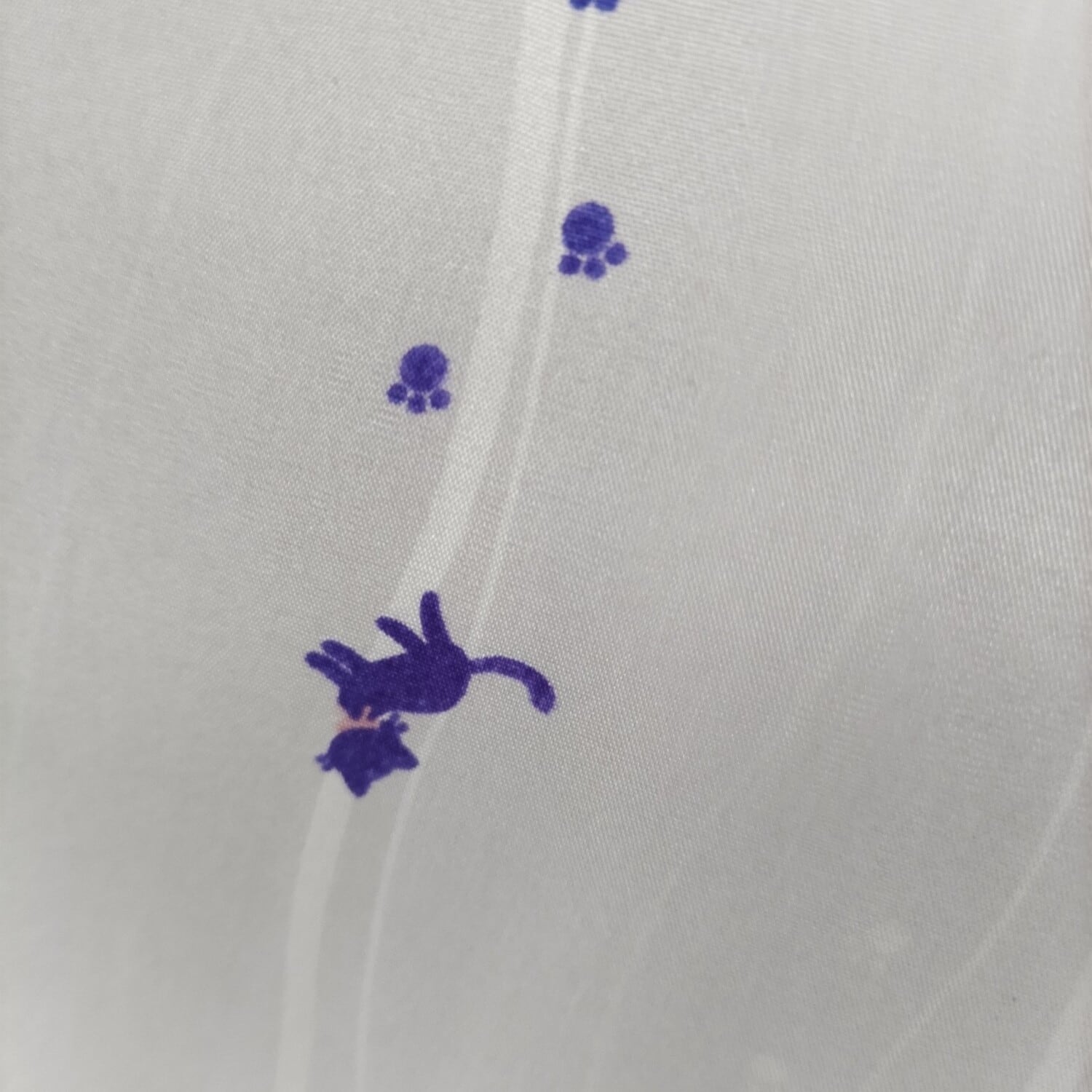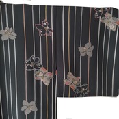 濃い茶色系の地色に縞に椿の柄の長羽織です。ちいさな猫のかわいい羽裏を付けてあります。