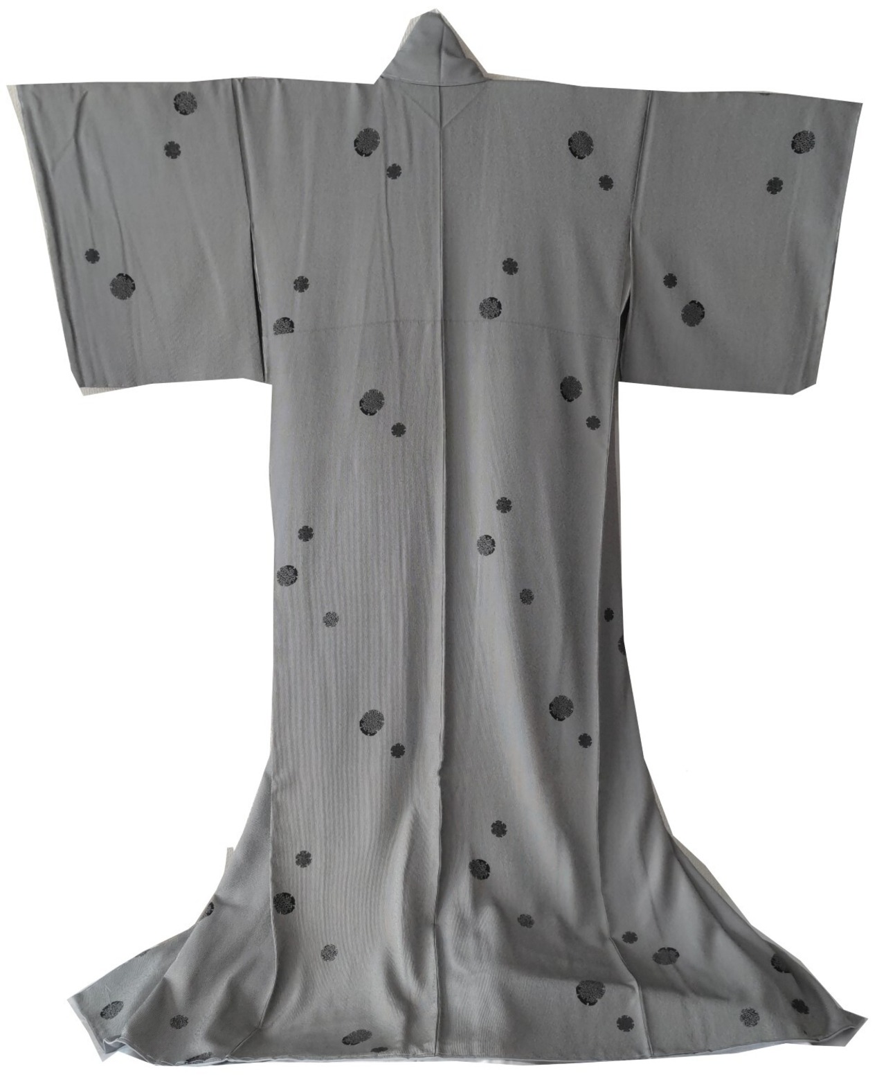 グレーの縮緬地の万筋に雪輪の模様の小紋です。八掛もグレー系で全体的に単色なので色々コーディネイトを楽しめると思います。サイズは身丈167cm ゆき68cm 袖丈49cm