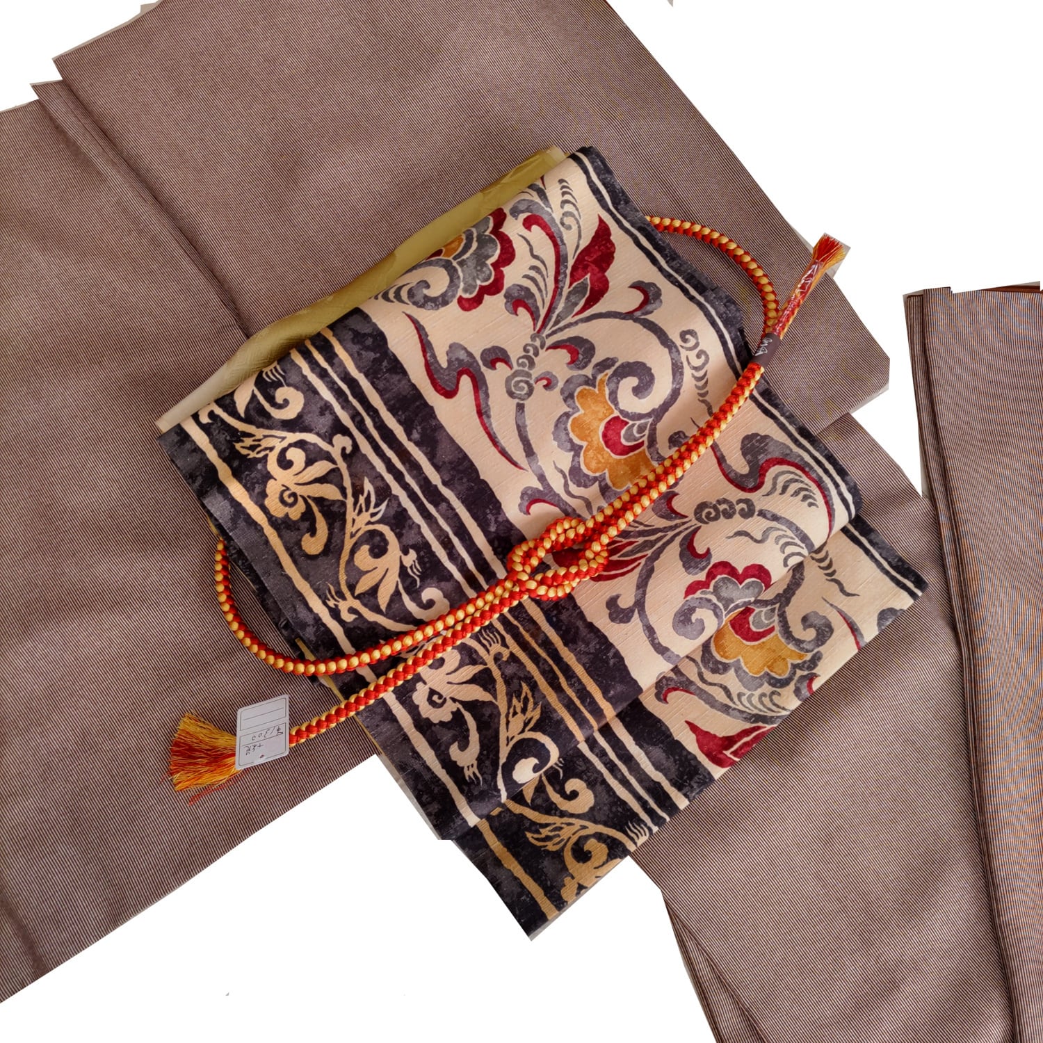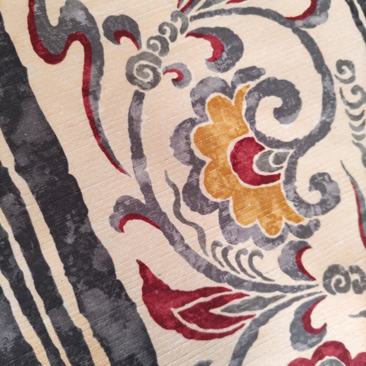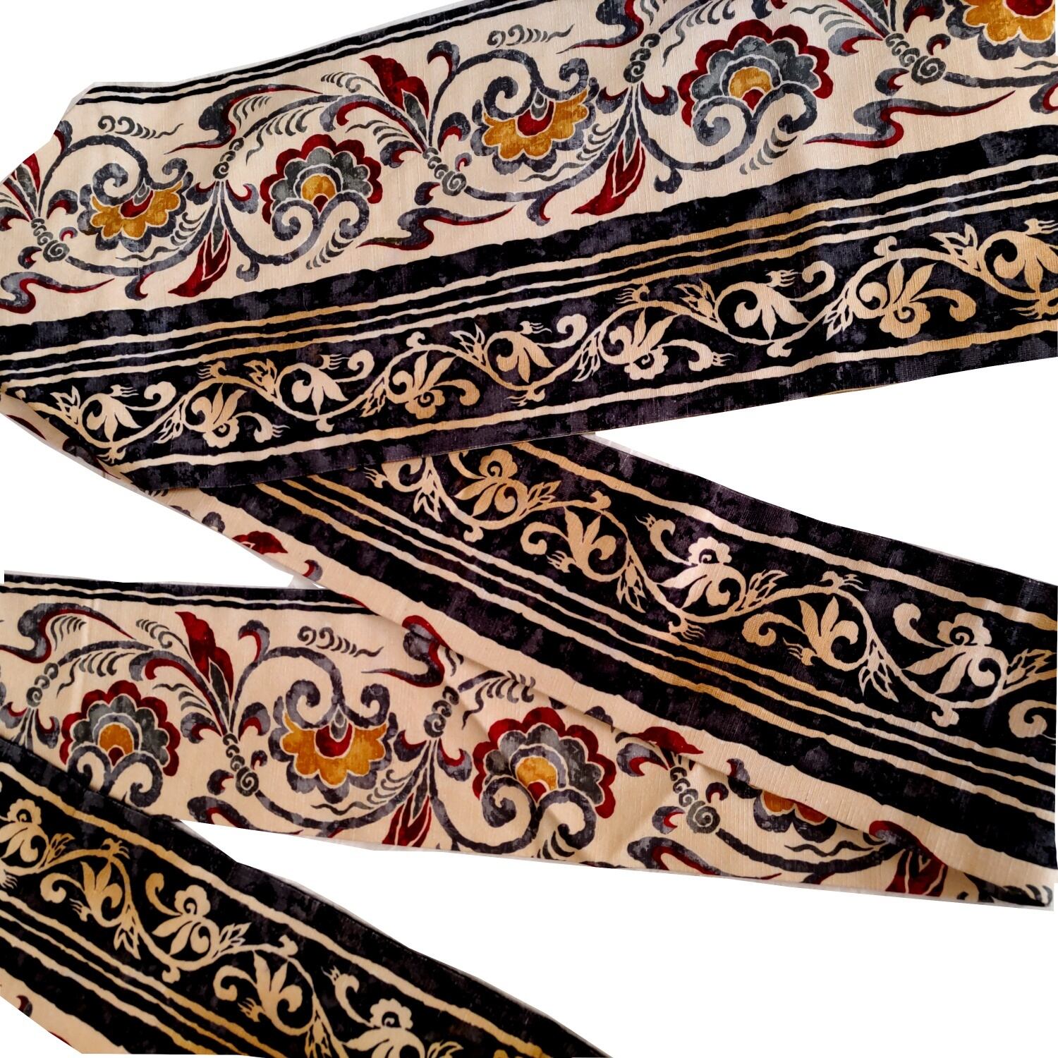 型染め紬地の更紗調名古屋帯です。生地感がしなやかで締めやすそうです。写真のような万筋の着物や大島、結城の紬類、小紋等カジュアルなお着物に使って頂けます。お太鼓巾31cm、長さ3m85cm 少々長めです。状態はあまり使用感無くきれいな状態です。
