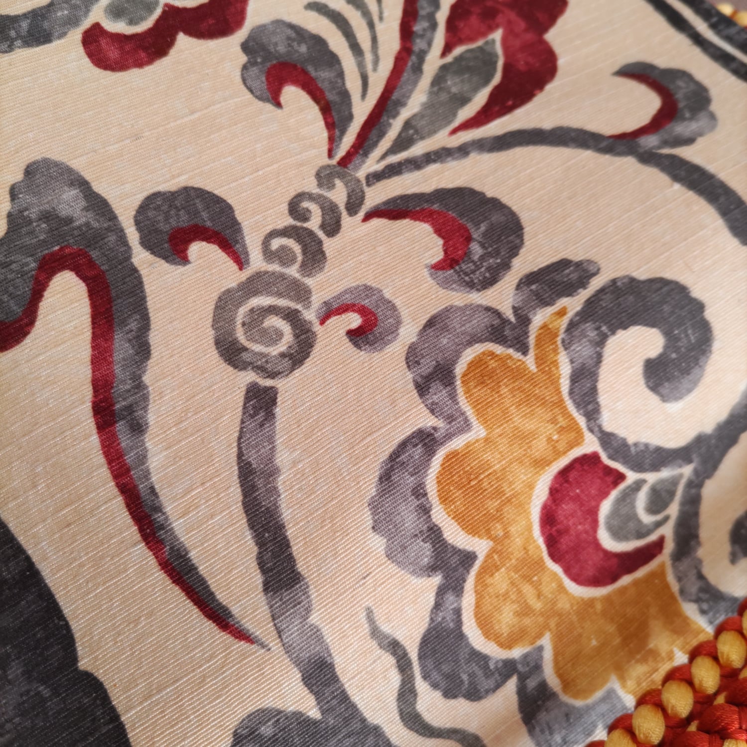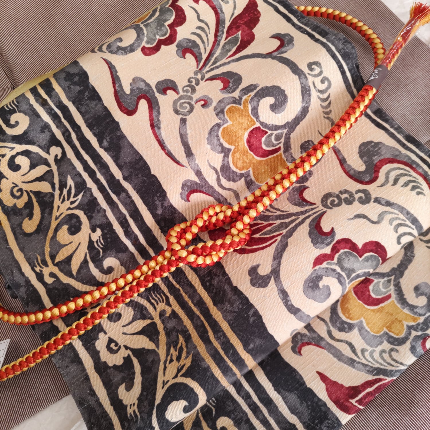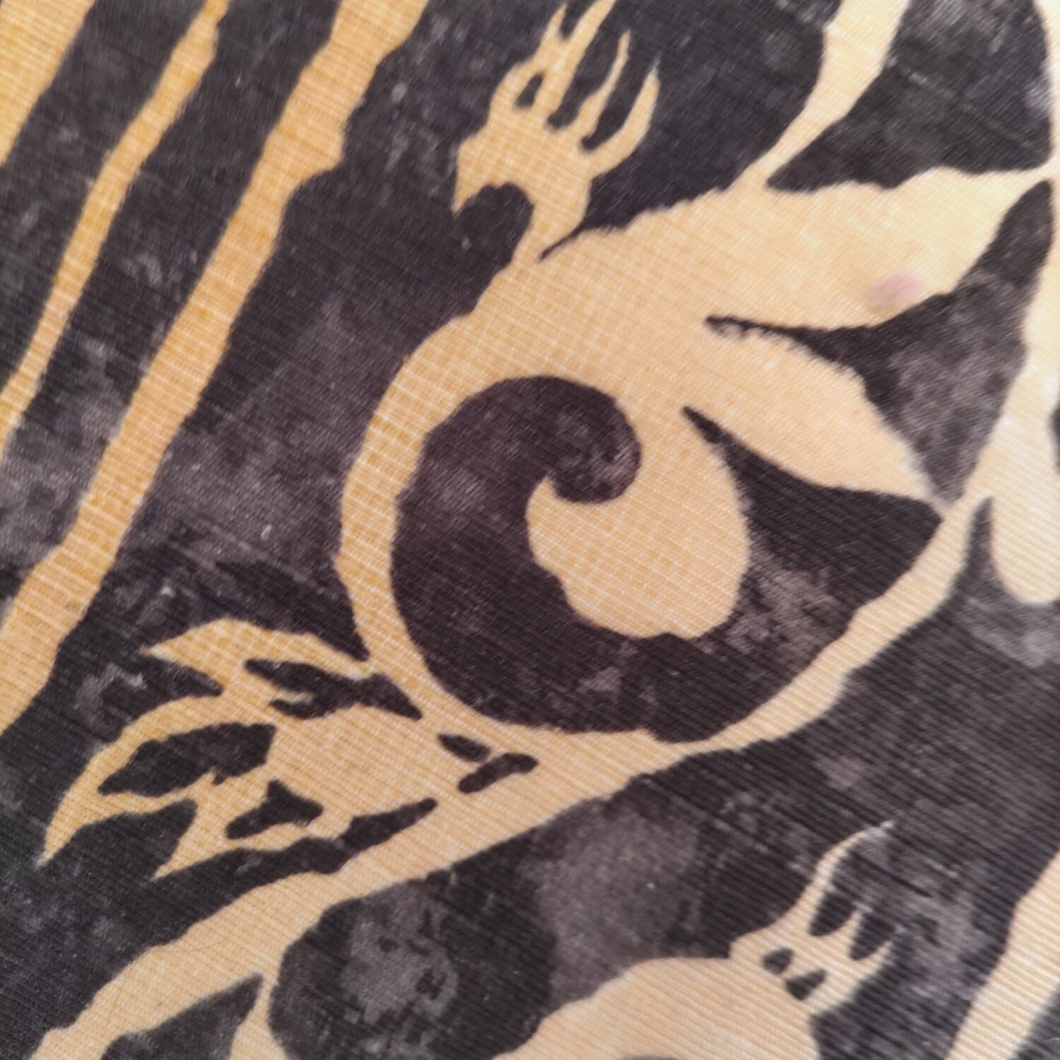 型染め紬地の更紗調名古屋帯です。生地感がしなやかで締めやすそうです。写真のような万筋の着物や大島、結城の紬類、小紋等カジュアルなお着物に使って頂けます。お太鼓巾31cm、長さ3m85cm 少々長めです。状態はあまり使用感無くきれいな状態です。