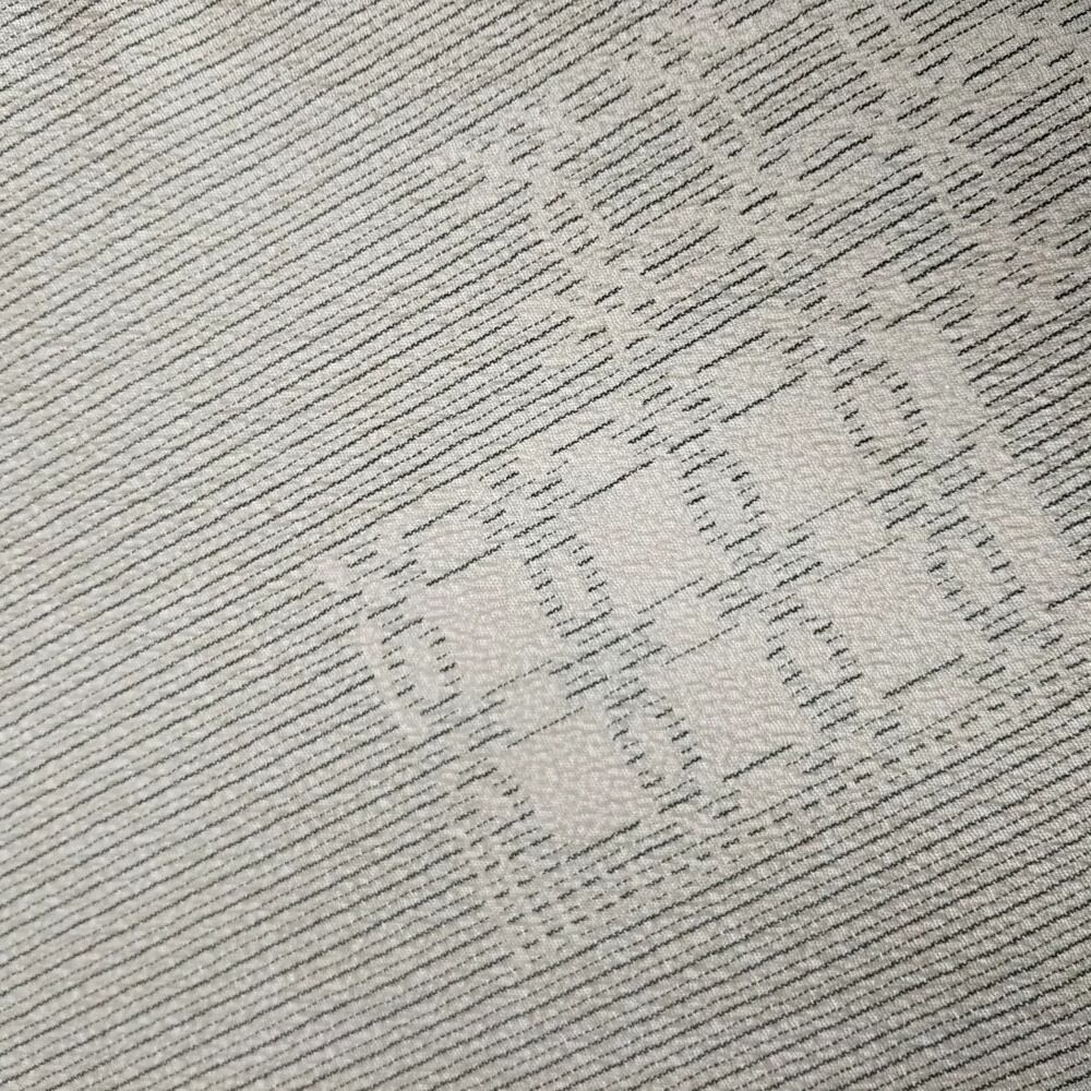 縞に七宝の四角のパターンの塩沢お召しです。サイズは身丈165cm ゆき68cm 袖丈49cm 前巾25cm 後巾30cmです。状態は未使用品で綺麗です。モノトーンで帯は合わせやすいし、八掛もきれいなやさしい色でいいと思います。
