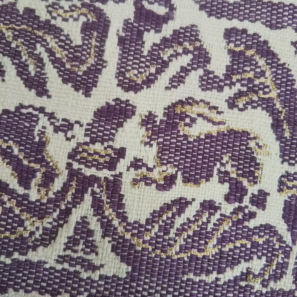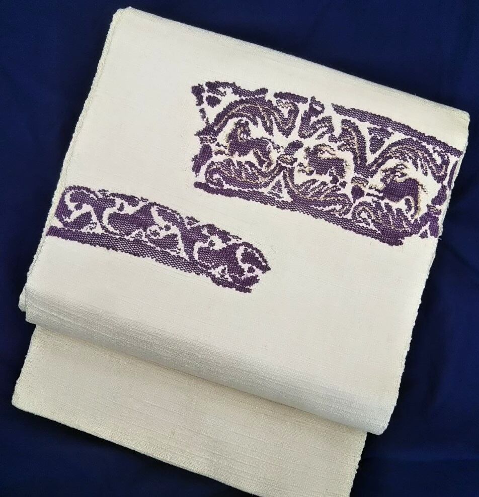 希少な貝の色素から取り出した紫(一つの貝では微少で染めるのには非常にたくさんの量の貝が必要な為高価でエジプトではクレオパトラの衣装や王族の衣装などに使われた)で染色した糸で織った名古屋帯です。サイズは長さ3m63cm お太鼓巾31,5cmです。お仕立ては八寸かがり松葉仕立てで前太鼓の巾は調節していただけます。状態は数回使用してありお太鼓の上しめると帯枕の背中にあたる所に若干の汚れ(最後の写真)がありますが着用に支障なく良好な状態です。
