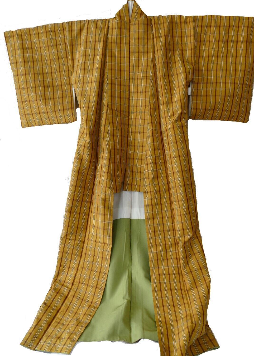 日本橋の老舗呉服問屋の近藤傳さんが別機で製作されている黄八丈です。草木染を何回も行い染めた糸で織ったい味わいあるお色目の着物だと思います。サイズは身丈165cm ゆき67cm 袖丈53cm 前幅25cm 後幅30cmです。リサイクルになりますが特に汚れ等目につくものなく良好な状態です。